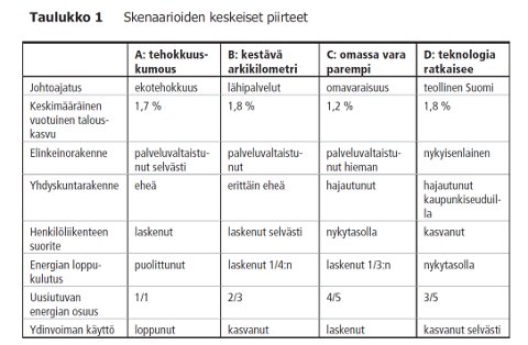 Ensimmäisessä skenaariossa johtoajatuksena on energiatehokkuuden vallankumous. Toisessa yhdyskunnat ja palvelut järjestetään niin, että liikennetarve minimoituu. Kolmannessa pyritään tuotannossa mahdollisimman suureen omavaraisuuteen ja paikallisuuteen. Neljäs skenaario perustuu teollisuuden tuotannon vahvaan kasvuun ja päästöjen leikkaamiseen teknisin ratkaisuin.